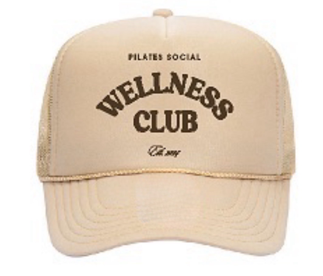 A beige trucker-style hat featuring the Pilates Social Wellness Club logo printed in dark brown. Designed with a mesh back and adjustable snap closure for a relaxed, breathable fit. A neutral and easy-to-style piece for everyday wear.