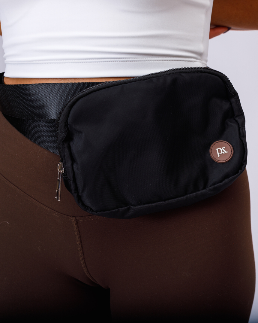 A black belt bag featuring the small ps. logo patch on the front. Designed with a zippered main pocket and adjustable strap for a comfortable, hands-free fit. Lightweight and simple for everyday wear or on-the-go use.