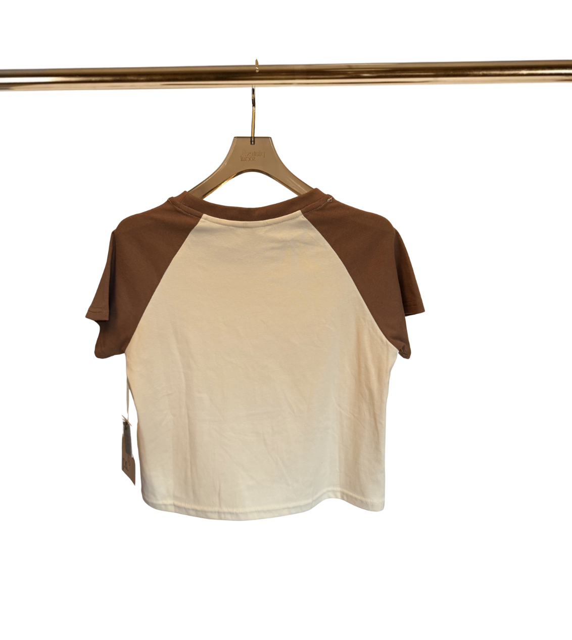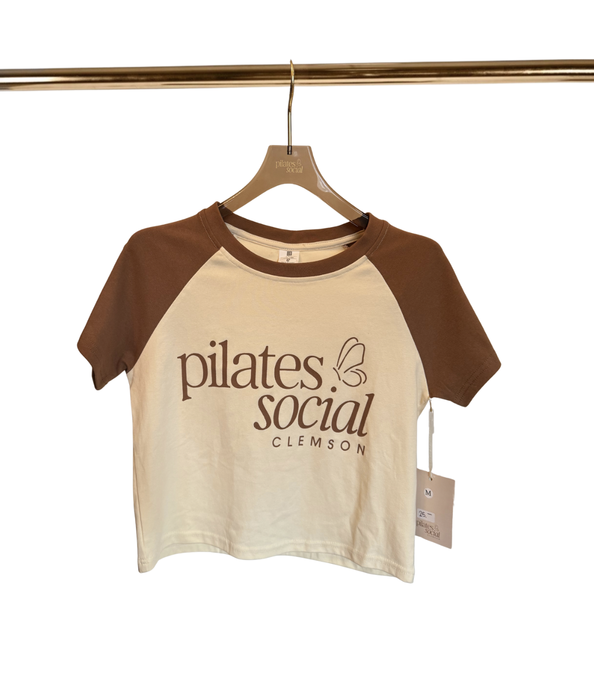 A cropped baby tee with ivory fabric and brown raglan sleeves. Features the Pilates Social Clemson logo printed on the front. Made from soft, lightweight cotton for a fitted, comfortable look.
