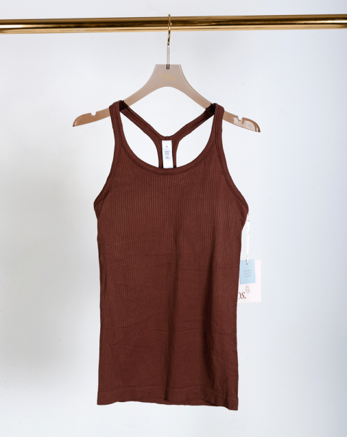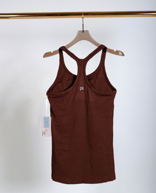 A fitted brown ribbed tank with a razor back design. Made from soft, stretchy fabric for a comfortable fit. Features a small ps. logo on the back. Perfect for class, workouts, or everyday wear.