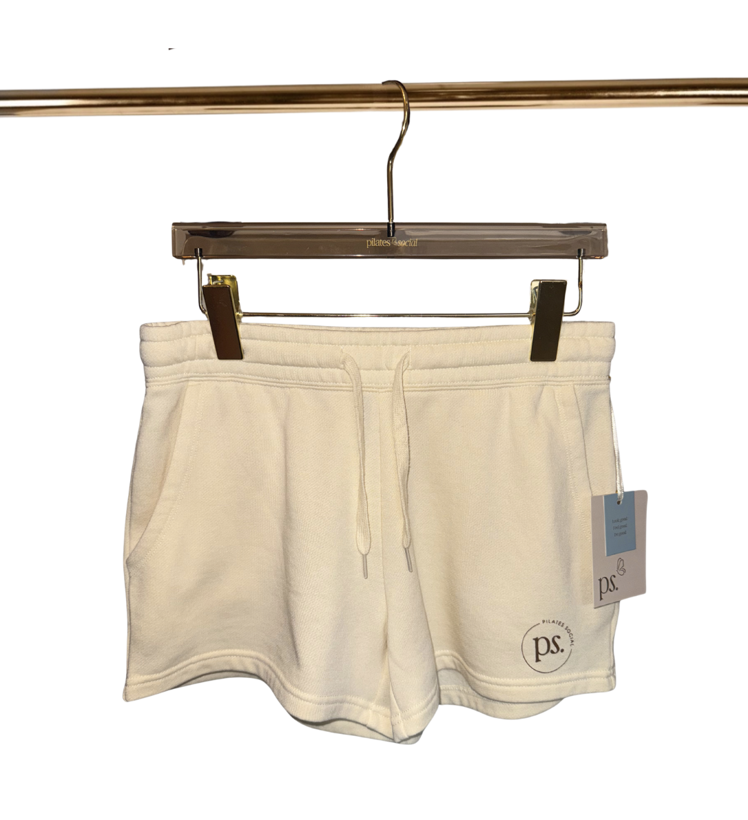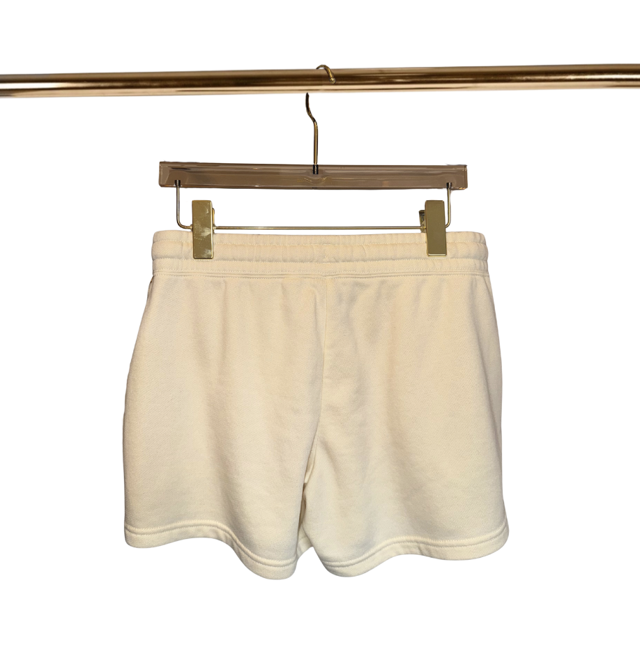 Cream sweat shorts featuring the small ps. logo on the front. Made from soft, lightweight fleece fabric with side pockets, an elastic waistband, and adjustable drawstring for a relaxed fit. Great for lounging or everyday wear.
