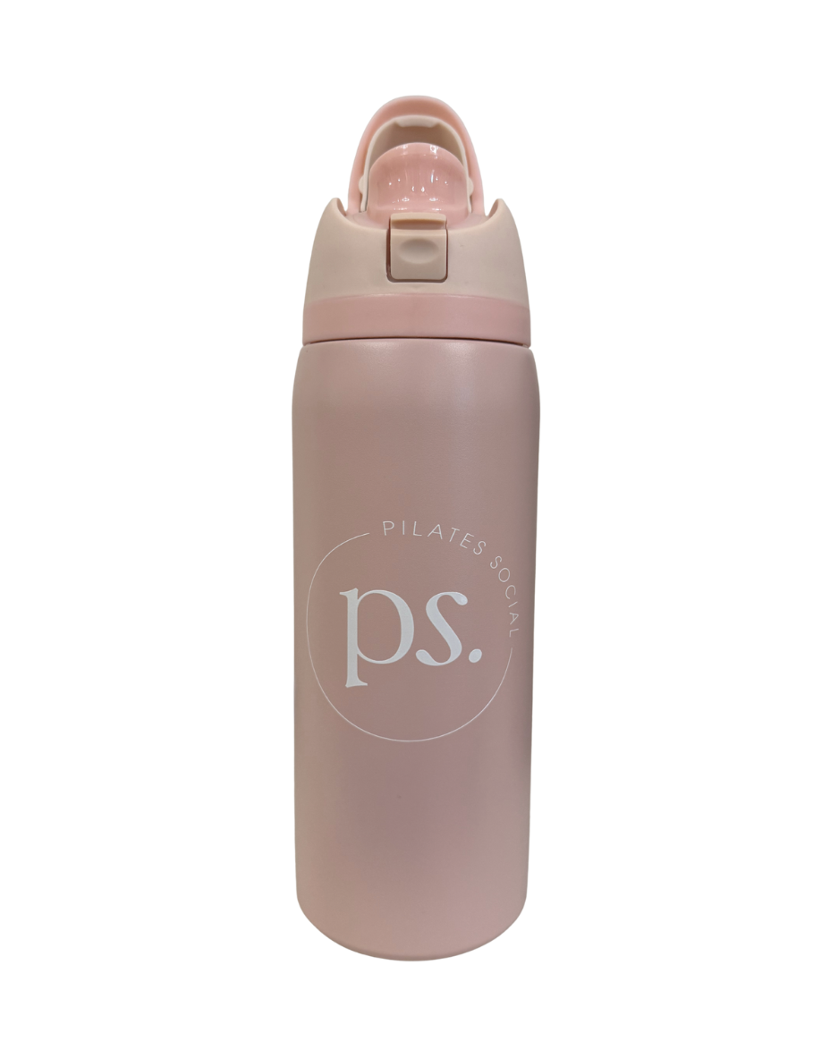 A matte pink water bottle featuring the Pilates Social ps. logo printed in white. Designed with a flip-top lid and secure seal to prevent leaks. Durable, easy to carry, and perfect for staying hydrated during class or on the go.