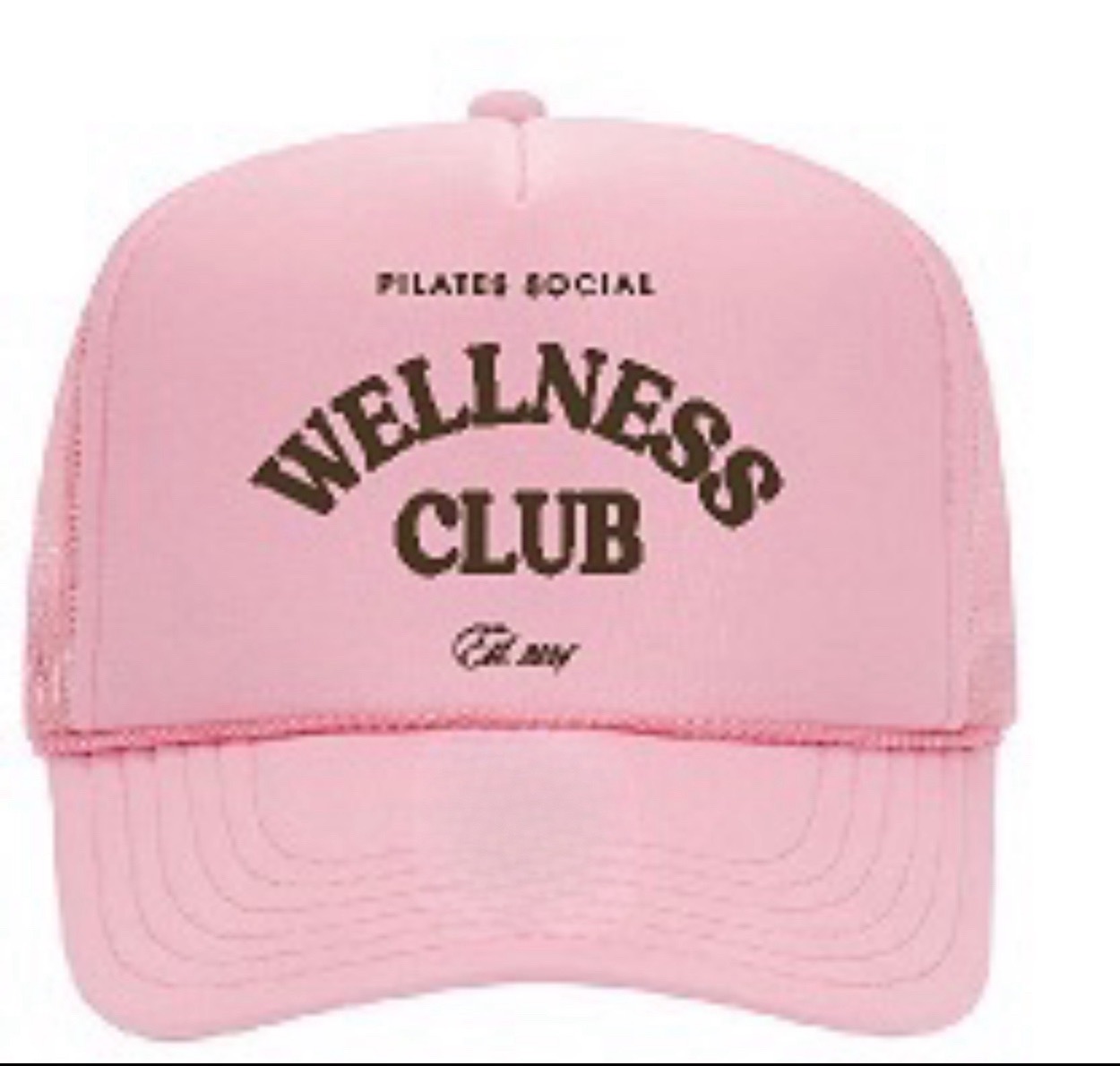 A pink trucker-style hat featuring the Pilates Social Wellness Club logo printed in brown. Designed with a mesh back and adjustable snap closure for a comfortable, breathable fit. A bright and fun addition to any outfit.