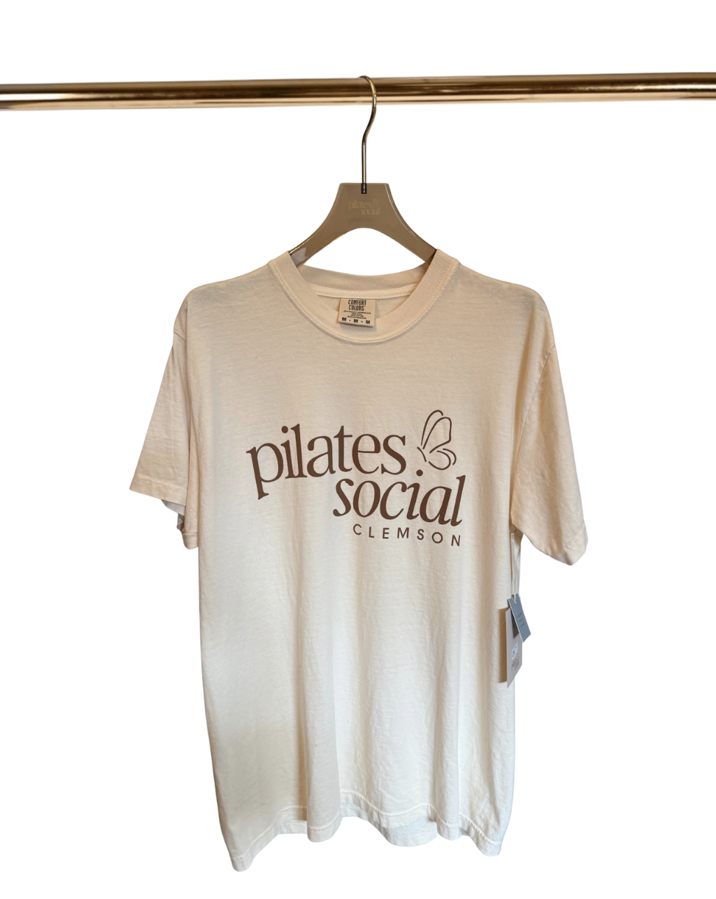 An ivory short-sleeve tee featuring the Pilates Social Clemson logo printed in brown. Made from soft cotton fabric for a relaxed, lightweight feel. Simple and classic for everyday wear.
