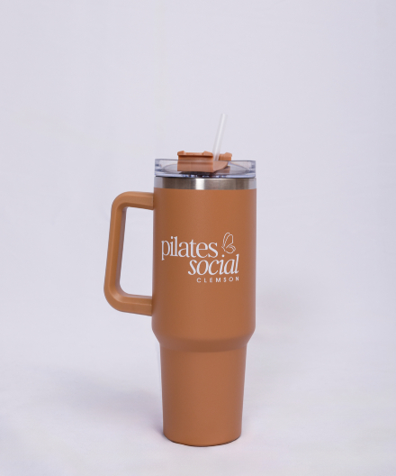 A cappuccino colored stainless steel tumbler featuring the Pilates Social Clemson logo printed in white. Designed with a sturdy handle, clear lid, and straw for easy sipping on the go. Keeps drinks hot or cold for hours.