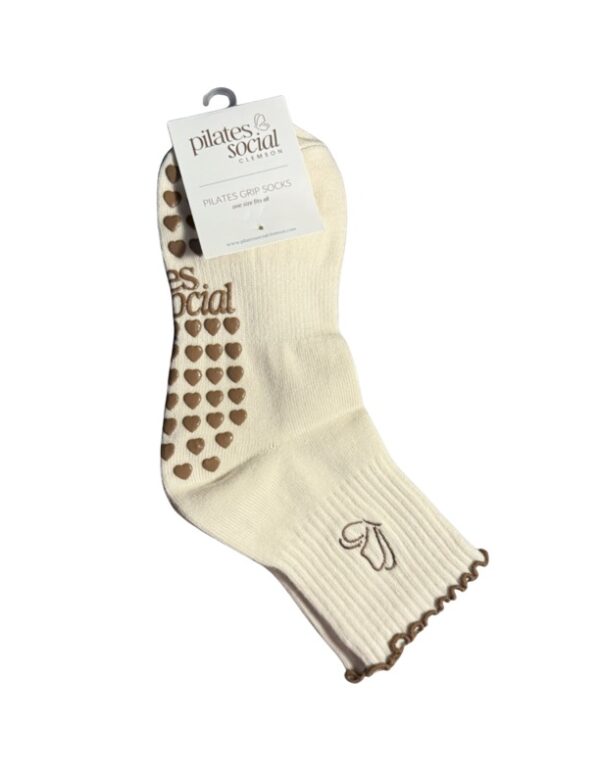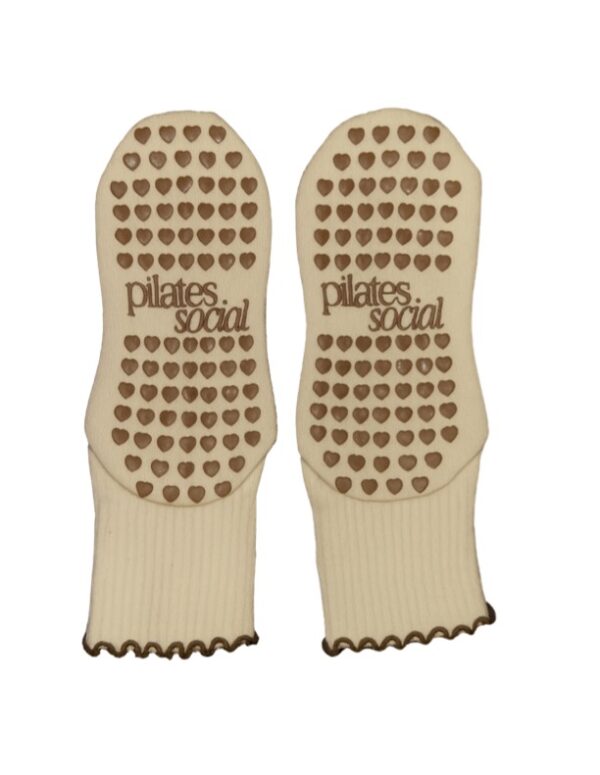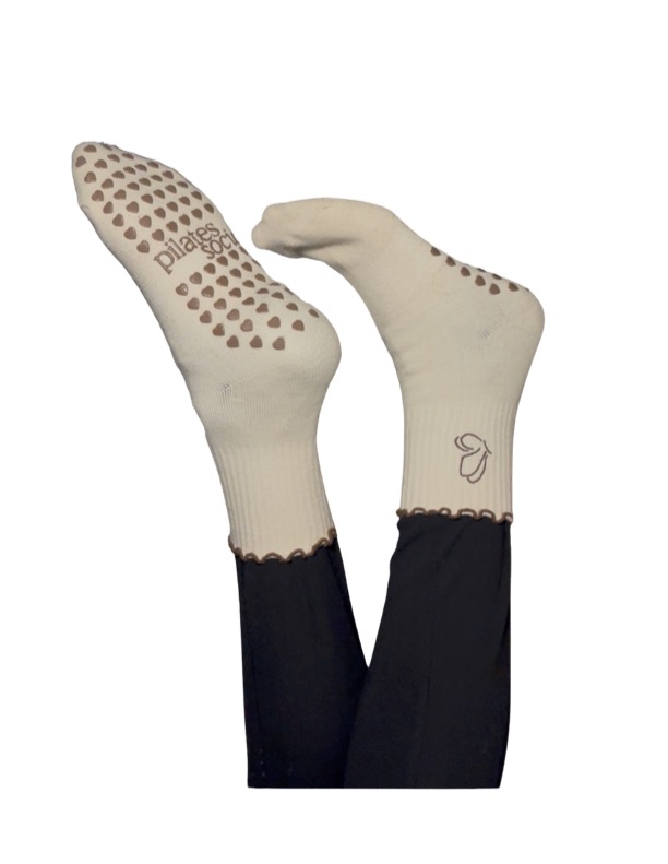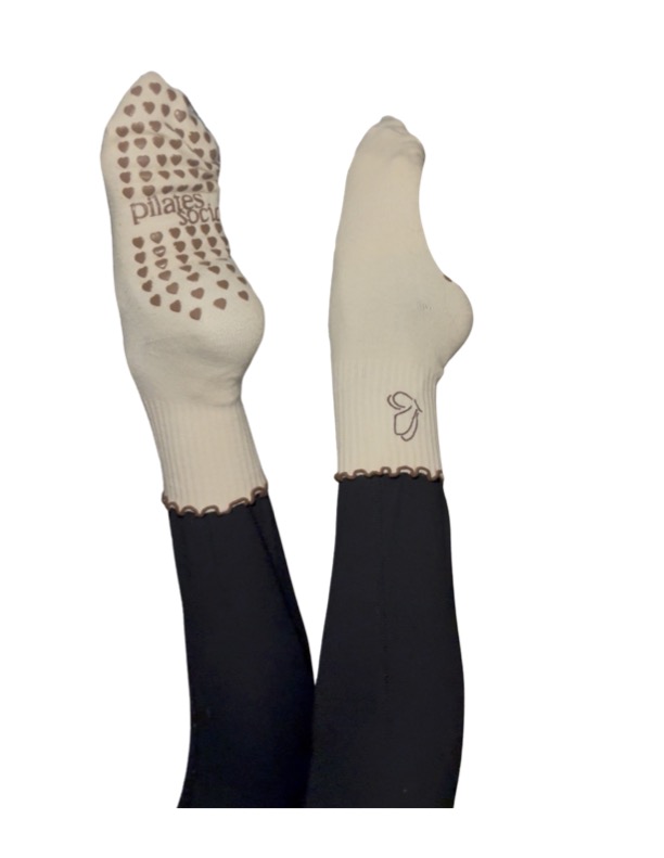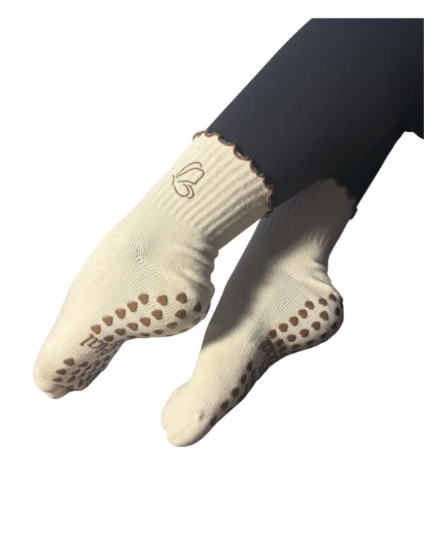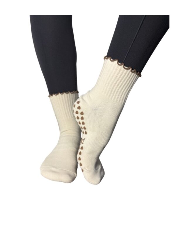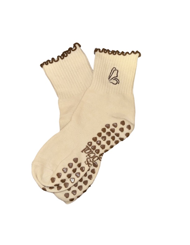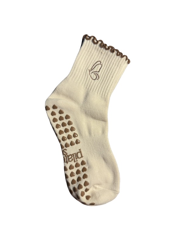 From our Frill Collection, brown fringe and our Signature brown butterfly on an off white mid sock, with brown heart shaped grips.