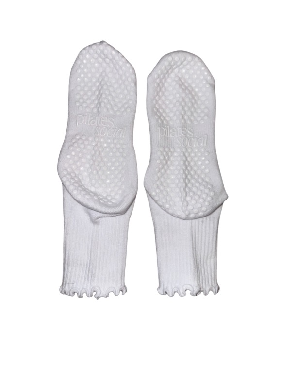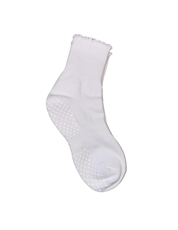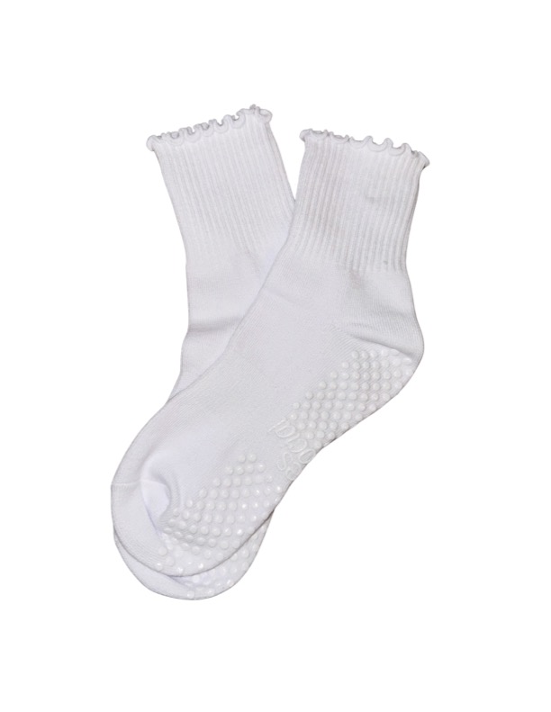 From our Frill Collection, white fringe on a solid white mid sock, with white dot shaped grips.