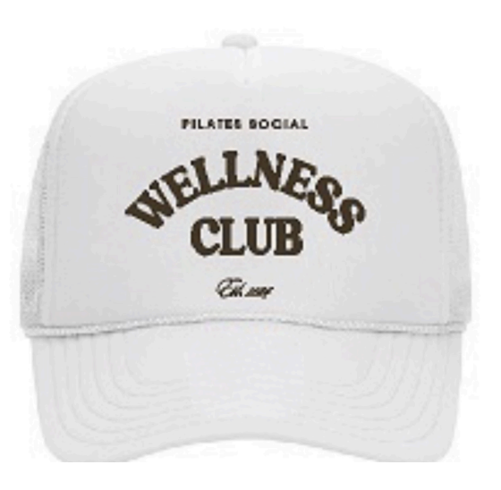 A white trucker-style hat featuring the pilates social wellness club logo embroidered in brown. Designed with a breathable mesh back and adjustable snap closure for a relaxed, comfortable fit. A clean, neutral staple for any look.